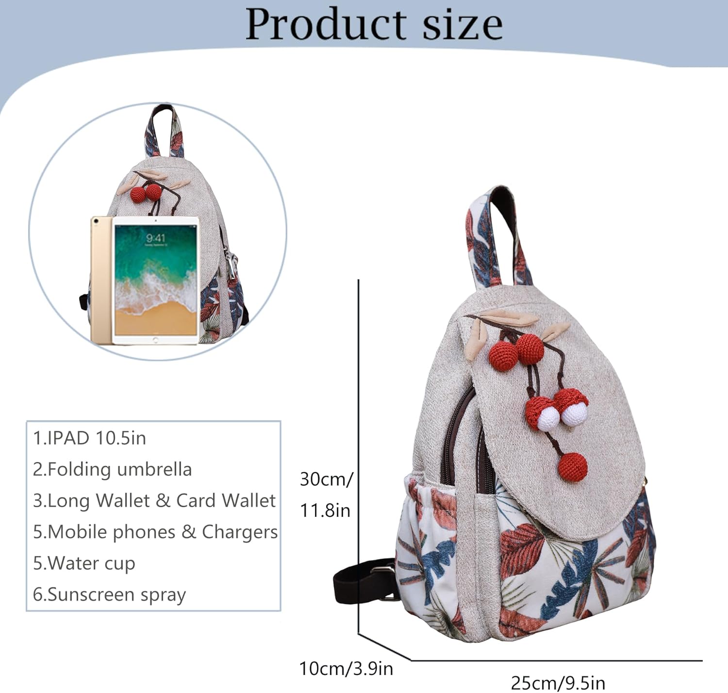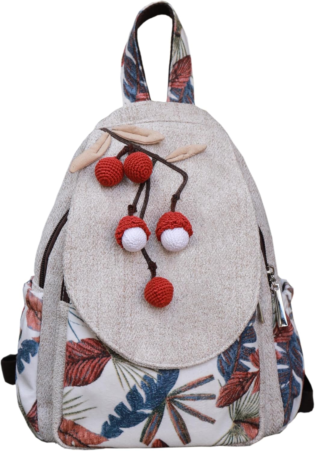 Cute personality women’s backpack, ladies’ canvas shoulder bag, hand-made original lychee art personality ultra-light multi-compartment small